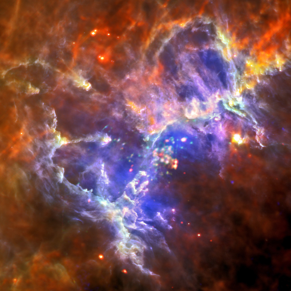 Combining almost opposite ends of the electromagnetic spectrum, this composite image of the Herschel in far-infrared and XMM-Newton's X-ray images obtained January 20, 2012, shows how the hot young stars detected by the X-ray observations are sculpting and interacting with the surrounding ultra-cool gas and dust, which, at only a few degrees above absolute zero, is the critical material for star formation itself. Both wavelengths would be blocked by Earth's atmosphere, so are critical to our understanding of the lifecycle of stars . (AFP / Getty Images)