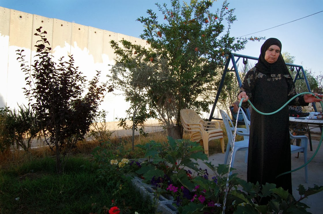 Ishaq's mother, Munira, waters petunias as she talks about the first years of the wall. She says even after they got the key, their movement was restricted and Ishaq was frequently not able to cross the barrier to play soccer with his friends.