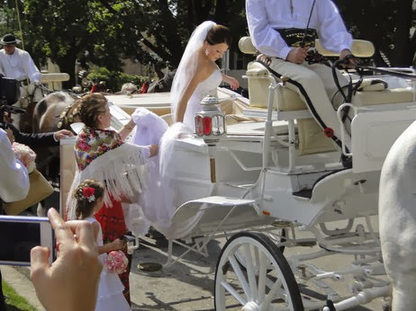 After the blessing, it's time for church. The bride loads into one carriage with her family, and the groom's entourage into another.