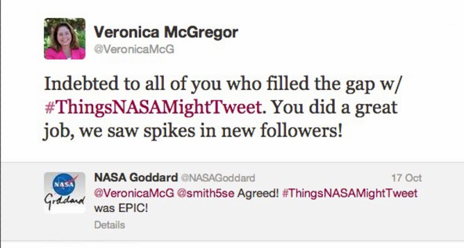Within this community, the #ThingsNASAMightTweet-ers weren’t just exchanging news amongst themselves: they were recreating a service on which a broad range of people had come to rely. Some tweeters had scientific expertise, some were NASA staff, most were an interested public. Effectively, an international public took on the communication role of a US government agency — possibly a first in the annals of governance.