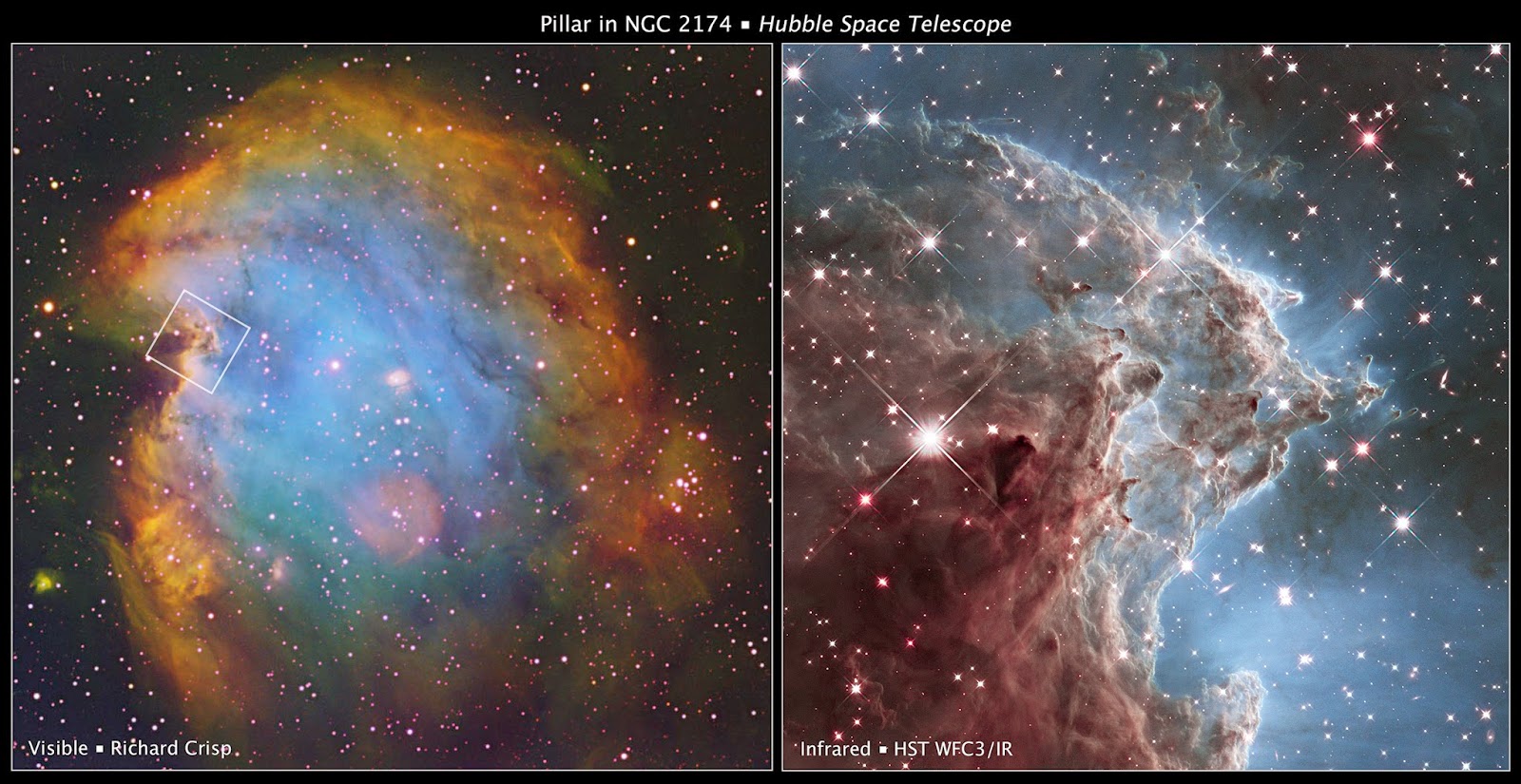 This graphic shows the location of the infrared image from the Hubble Space Telescope in a wider view of the region of NGC 2174. On the left is a ground-based image of the star-forming nebula in visible light by an amateur astrophotographer, with an outline showing the area of the detailed Hubble image. On the right is a small detail of a star-forming column in the nebula, made by Hubble's WFC3 infrared camera.