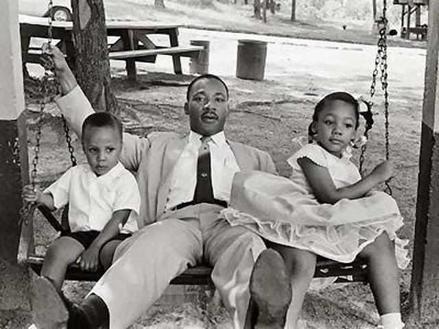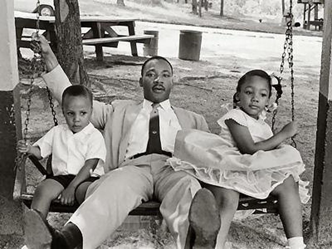 Martin Luther King Jr sits on a swing with his eldest daughter, Yolanda, and eldest son, Martin, at an amusement park he helped desegregate.