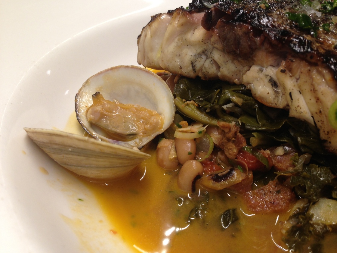 For instance, he takes the leftover pot liquor from collards and reduces it with a sauté of garlic, shallots, tomato concasse, chicken stock, black-eyed peas and clams, then pours it over an entire grilled fish. Tasty.