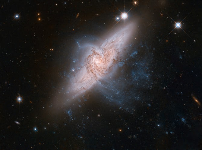 NGC 3314 is actually two galaxies overlapping. They’re not colliding – as they are separated by tens of millions of light-years – but from our perspective, the pair appears to be in a weird cosmic dance.