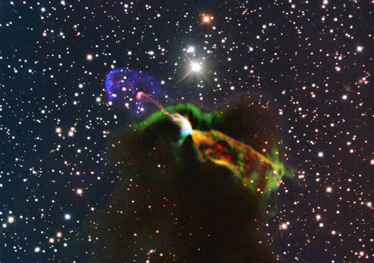 This image of Herbig-Haro object HH 46/47 combines radio observations acquired with the Atacama Large Millimeter/submillimeter Array (ALMA) with much shorter wavelength visible light observations from ESO’s New Technology Telescope (NTT). The ALMA observations (orange and green, lower right) of the newborn star reveal a large energetic jet moving away from us, which in the visible is hidden by dust and gas. To the left (in pink and purple) the visible part of the jet is seen, streaming partly towards us.