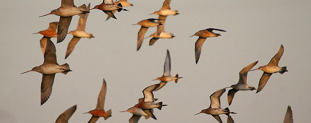 They are the only birds known to fly more than 7,000 miles nonstop, that means no food breaks, no water breaks, no sleep breaks, no pausing, just pushing through cyclones, storms, headwinds, flappity flap, flap for days and nights — and this is their championship season. In September and October, they leave Alaska, head straight for the ocean. Though they are land birds, and cannot fish or rest on the sea, they will cross most of the Pacific Ocean, and fly all the way to New Zealand. Many of them are young, and have never done this before. No other bird can do what they do, and they're doing it right now.
