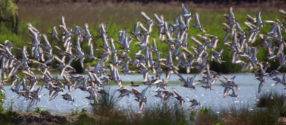 Black-tailed Godwits flying.